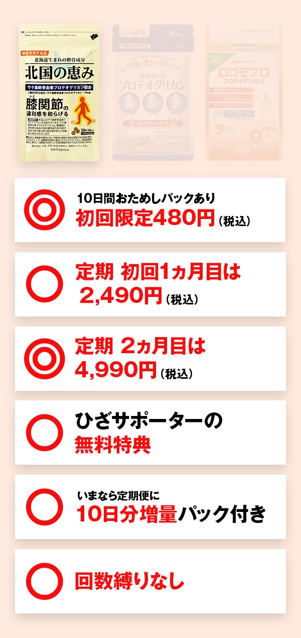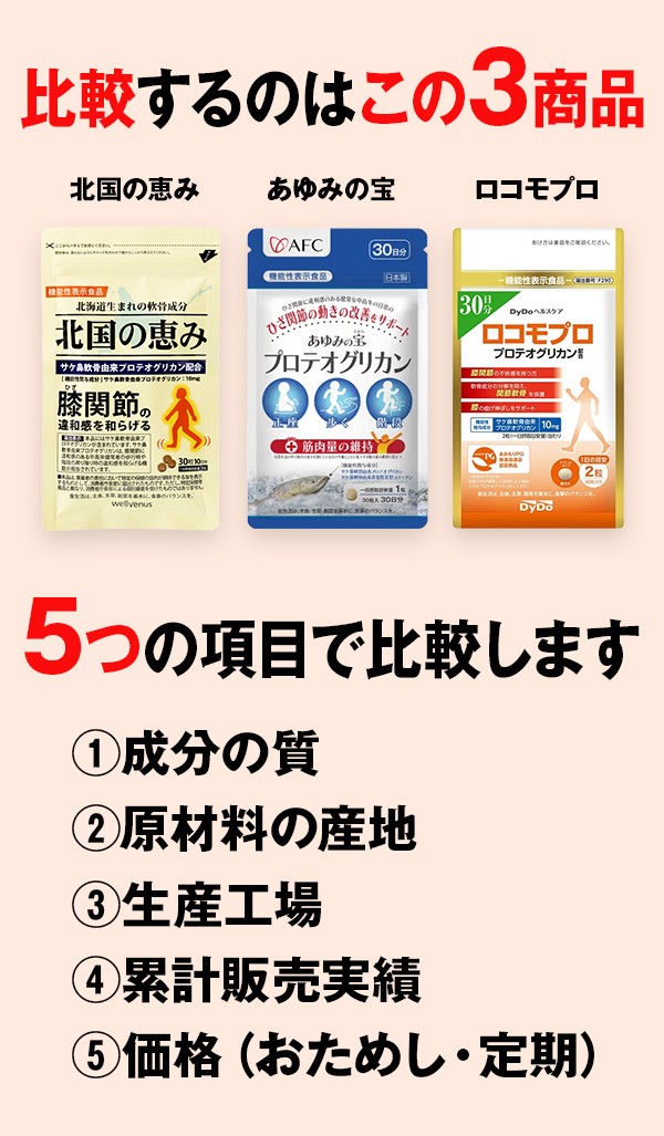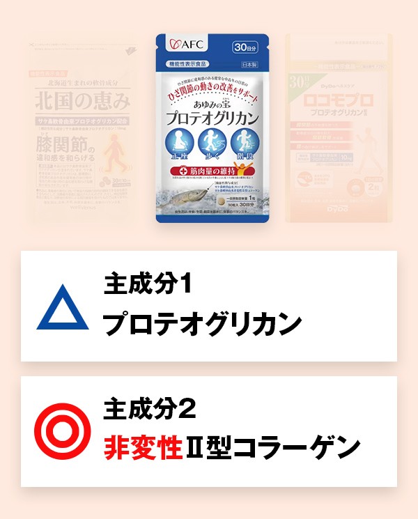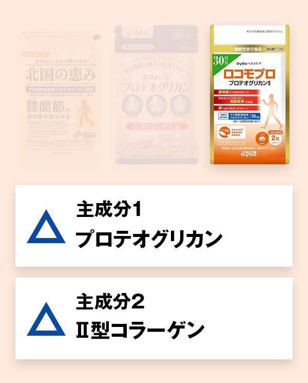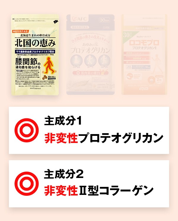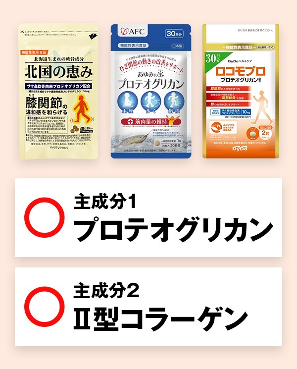 実は、今回選んだ3商品はすべて、「プロテオグリカン」と「Ⅱ型コラーゲン」を両方配合。