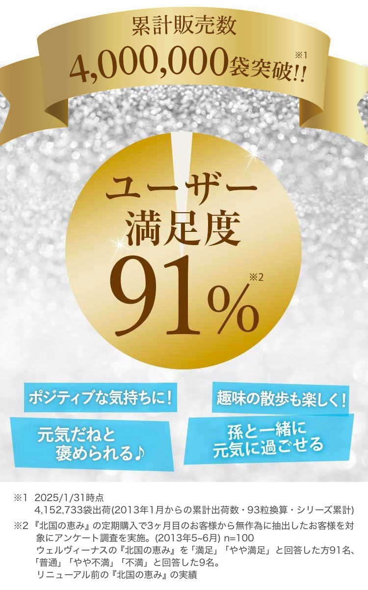 「北国の恵み」は愛用者の満足度が91%と非常に高く、「3ヶ月以内に約7割の方が実感」されていると驚きの実績です。